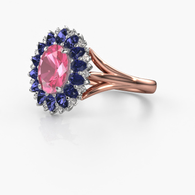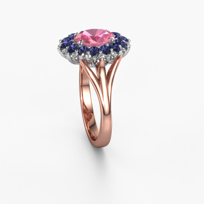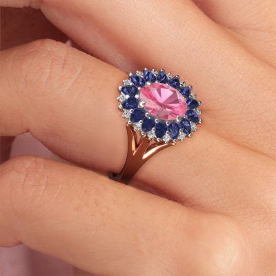 The ring shown above is called the Lidia. We call this type of ring a cluster ring. The centre gemstone is surrounded by smaller sized stones. This 14 Carat rose gold version is set with a 8x6 mm oval pink sapphire centre stone, embraced by smaller sapphire. What makes this vintage rose gold cluster ring special is the setting of the smaller gems surrounding the centre pink sapphire, which are shaped like a beautiful flower. The surrounding cluster of stones frame the middle centre stone in such a way to make it appear bigger. This type of engagement ring is also called a flower ring. It is very important that the smaller sapphire are positioned identically so there is no interference of light but perfect unity instead. Our skilled Goldsmiths get the job done. Each individual stone is carefully set by hand. During manufacturing, light fall is constantly monitored to make sure the special cluster effect is still visible. In the end you get the perfect engagement ring with a radiant pink sapphire gemstone centrepiece. You can imagine the effect of a ring of such significance when you give tot the love of your life on her special day to shine. This jewel is made with passion and love by one of our master goldsmiths.By using a combination of the latest modern techniques, combined with ancient crafting, we can make all our engagement rings in our own studio. Each jewel is made to order. This is advantageous because we can offer you a price you won't find anywhere else.Have you found a specific engagement ring somewhere which you would like to give to your loved one? Please feel free to express your wishes to our jewel designers because we would be honoured to turn your design into a vintage engagement ring. You can follow the development of your ring design because we use 3D drawings. This gives you a realistic preview of how your design will look. You can also preorder a dummy. A dummy is a plastic ring, which can be shaped according your ring design. You can try it on and check if its width and size are suitable for you. We will gladly send you a non-binding offer, based on a fair price/ quality ratio. It will amaze you, considering the quality of the ring and gemstones.To make it easier for you, we offer a 30 day return policy. Check our terms and conditions.
