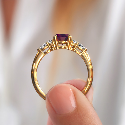 This 14 Carat gold ring is called Melani OVL and is set with 8x6 mm rhodolite. This exclusive gold cluster engagement ring is a true work of art! The ornaments are crafted with a lot of patience and great passion. In order to create this ring with great precision, this craft requires a keen eye and skilful hand. A challenge which ignites a fire in our expert goldsmith. The exquisite rhodolite are set in a special way so they stand out even more. This gives the ring an even more glamorous appearance. The stylish engagement ring is actually unique on its own because of the gemstones which we carefully select especially for this ring. On top of that you select the precious metals which will be used to create a unique ring for the most extraordinary woman in your life! This jewel is made by a team of passionate goldsmiths and jewel designers. This will make your crown jewel truly eye-catching.By using a combination of the latest modern techniques, combined with ancient crafting, we can make all our engagement rings in our own studio. Each jewel is made to order. This is advantageous because we can offer you a price you won't find anywhere else.Our designers and goldsmiths work together each day, creating new jewels. Perhaps you have found a nice fashionable engagement ring somewhere, which can be used to customize your unique ring. Please feel free to contact us. We will make you an offer, based on a fair price/ quality ratio, which will amaze you.To make it easier for you, we offer a 30 day return policy. Check our terms and conditions.