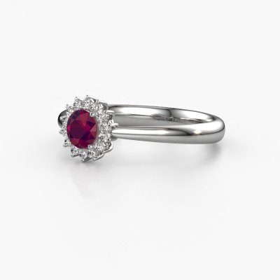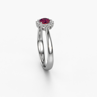 The ring shown above is called the Tilly RND 1. We call this type of ring a cluster ring. The centre gemstone is surrounded by smaller sized stones. This 14 Carat white gold version is set with a 4.2 mm round rhodolite centre stone, embraced by smaller diamonds. What makes this classic white gold cluster ring special is the setting of the smaller gems surrounding the centre rhodolite, which are shaped like a beautiful flower. The surrounding cluster of stones frame the middle centre stone in such a way to make it appear bigger. This type of engagement ring is also called a flower ring. It is very important that the smaller diamonds are positioned identically so there is no interference of light but perfect unity instead. Our skilled Goldsmiths get the job done. Each individual stone is carefully set by hand. During manufacturing, light fall is constantly monitored to make sure the special cluster effect is still visible. In the end you get the perfect engagement ring with a radiant rhodolite gemstone centrepiece. You can imagine the effect of a ring of such significance when you give tot the love of your life on her special day to shine. This jewel is made to shine bright around your finger. Each jewel is hand made with love by our goldsmiths.By using a combination of the latest modern techniques, combined with ancient crafting, we can make all our engagement rings in our own studio. Each jewel is made to order. This is advantageous because we can offer you a price you won't find anywhere else.Our team adds new designs to our online collection daily. Our designers and goldsmiths work together in creating the best design. We strive to offer a diverse collection of jewels. Perhaps you have a specific jewel design in mind. One you came across somewhere. Please contact us for a free consultation. We will make you an offer, based on a fair price/ quality ratio, that will baffle you.To make it easier for you, we offer a 30 day return policy. Check our terms and conditions.