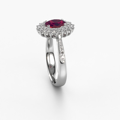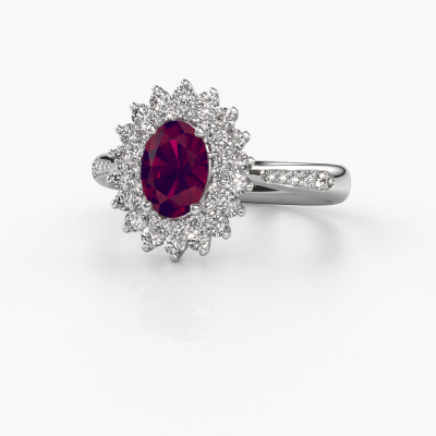The ring shown above is called the Alina 2. We call this type of ring a cluster ring. The centre gemstone is surrounded by smaller sized stones. This 14 Carat white gold version is set with a 7x5 mm oval rhodolite centre stone, embraced by smaller diamonds. What makes this exclusive white gold cluster ring special is the setting of the smaller gems surrounding the centre rhodolite, which are shaped like a beautiful flower. The surrounding cluster of stones frame the middle centre stone in such a way to make it appear bigger. This type of engagement ring is also called a flower ring. It is very important that the smaller diamonds are positioned identically so there is no interference of light but perfect unity instead. Our skilled Goldsmiths get the job done. Each individual stone is carefully set by hand. During manufacturing, light fall is constantly monitored to make sure the special cluster effect is still visible. In the end you get the perfect engagement ring with a radiant rhodolite gemstone centrepiece. You can imagine the effect of a ring of such significance when you give tot the love of your life on her special day to shine. This jewel is made just for you, with attention to detail and design.By using a combination of the latest modern techniques, combined with ancient crafting, we can make all our engagement rings in our own studio. Each jewel is made to order. This is advantageous because we can offer you a price you won't find anywhere else.Have you found a specific engagement ring somewhere which you would like to give to your loved one? Please feel free to express your wishes to our jewel designers because we would be honoured to turn your design into a exclusive engagement ring. You can follow the development of your ring design because we use 3D drawings. This gives you a realistic preview of how your design will look. You can also preorder a dummy. A dummy is a plastic ring, which can be shaped according your ring design. You can try it on and check if its width and size are suitable for you. We will gladly send you a non-binding offer, based on a fair price/ quality ratio. It will amaze you, considering the quality of the ring and gemstones.To make it easier for you, we offer a 30 day return policy. Check our terms and conditions.