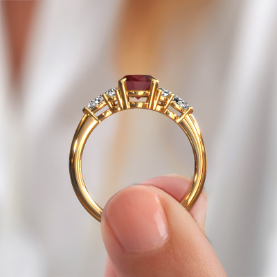 This 14 Carat gold ring is called Melani OVL and is set with 8x6 mm ruby. This exclusive gold cluster engagement ring is a true work of art! The ornaments are crafted with a lot of patience and great passion. In order to create this ring with great precision, this craft requires a keen eye and skilful hand. A challenge which ignites a fire in our expert goldsmith. The exquisite ruby are set in a special way so they stand out even more. This gives the ring an even more glamorous appearance. The stylish engagement ring is actually unique on its own because of the gemstones which we carefully select especially for this ring. On top of that you select the precious metals which will be used to create a unique ring for the most extraordinary woman in your life! This jewel is made by a team of passionate goldsmiths and jewel designers. This will make your crown jewel truly eye-catching.By using a combination of the latest modern techniques, combined with ancient crafting, we can make all our engagement rings in our own studio. Each jewel is made to order. This is advantageous because we can offer you a price you won't find anywhere else.Our designers and goldsmiths work together each day, creating new jewels. Perhaps you have found a nice fashionable engagement ring somewhere, which can be used to customize your unique ring. Please feel free to contact us. We will make you an offer, based on a fair price/ quality ratio, which will amaze you.To make it easier for you, we offer a 30 day return policy. Check our terms and conditions.