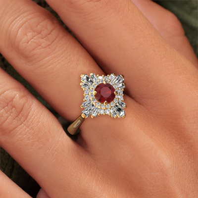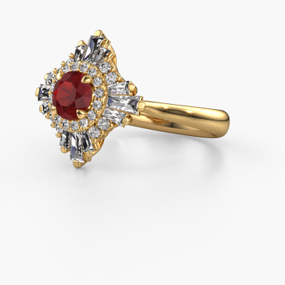 This 14 Carat gold ring is called Thalia and is set with 5.4 mm ruby. An extraordinary gold vintage ring. One that will surely make the love of your life shine like a diamond! That is what we hope to achieve. This vintage engagement ring is set with exquisite ruby. Whichever gemstone you choose from our selection, is up to you. The gemstone is selected with great care because we believe your special engagement ring must be adorned with nothing but the most beautiful gemstone. Wouldn't you agree? Our expert goldsmith will design your ring in our own crafting studio, where the ruby will be set with great precision. The ring will then be polished till it shines perfectly. Nothing but the best for the love of your life! This jewel is made with passion and love by one of our master goldsmiths.After receiving your order, our goldsmiths will passionately start the creative process of making your engagement ring in our own studio. Because we don't have a big stockpile, these costs will not be passed on to you. Our pricing is proof of that! We offer top quality jewels at lowest price, guaranteed.Have you found a specific engagement ring somewhere which you would like to give to your loved one? Please feel free to express your wishes to our jewel designers because we would be honoured to turn your design into a vintage engagement ring. You can follow the development of your ring design because we use 3D drawings. This gives you a realistic preview of how your design will look. You can also preorder a dummy. A dummy is a plastic ring, which can be shaped according your ring design. You can try it on and check if its width and size are suitable for you. We will gladly send you a non-binding offer, based on a fair price/ quality ratio. It will amaze you, considering the quality of the ring and gemstones.To make it easier for you, we offer a 30 day return policy. Check our terms and conditions.