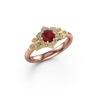 This 14 Carat rose gold ring is called Tatjana and is set with 5 mm ruby. An extraordinary rose gold vintage ring. One that will surely make the love of your life shine like a diamond! That is what we hope to achieve. This vintage engagement ring is set with exquisite ruby. Whichever gemstone you choose from our selection, is up to you. The gemstone is selected with great care because we believe your graceful engagement ring must be adorned with nothing but the most beautiful gemstone. Wouldn't you agree? Our expert goldsmith will design your ring in our own crafting studio, where the ruby will be set with great precision. The ring will then be polished till it shines perfectly. Nothing but the best for the love of your life! This jewel is made with passion and love by one of our master goldsmiths.After receiving your order, our goldsmiths will passionately start the creative process of making your engagement ring in our own studio. Because we don't have a big stockpile, these costs will not be passed on to you. Our pricing is proof of that! We offer top quality jewels at lowest price, guaranteed.Have you found a specific engagement ring somewhere which you would like to give to your loved one? Please feel free to express your wishes to our jewel designers because we would be honoured to turn your design into a vintage engagement ring. You can follow the development of your ring design because we use 3D drawings. This gives you a realistic preview of how your design will look. You can also preorder a dummy. A dummy is a plastic ring, which can be shaped according your ring design. You can try it on and check if its width and size are suitable for you. We will gladly send you a non-binding offer, based on a fair price/ quality ratio. It will amaze you, considering the quality of the ring and gemstones.To make it easier for you, we offer a 30 day return policy. Check our terms and conditions.