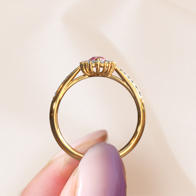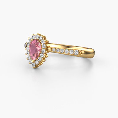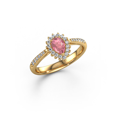 The ring shown above is called the Tilly per 2. We call this type of ring a cluster ring. The centre gemstone is surrounded by smaller sized stones. This 14 Carat gold version is set with a 6x4 mm pear tourmaline pink centre stone, embraced by smaller diamonds. What makes this exclusive gold cluster ring special is the setting of the smaller gems surrounding the centre tourmaline pink, which are shaped like a beautiful flower. The surrounding cluster of stones frame the middle centre stone in such a way to make it appear bigger. This type of engagement ring is also called a flower ring. It is very important that the smaller diamonds are positioned identically so there is no interference of light but perfect unity instead. Our skilled Goldsmiths get the job done. Each individual stone is carefully set by hand. During manufacturing, light fall is constantly monitored to make sure the special cluster effect is still visible. In the end you get the perfect engagement ring with a radiant tourmaline pink gemstone centrepiece. You can imagine the effect of a ring of such significance when you give tot the love of your life on her special day to shine. This jewel is made just for you, with attention to detail and design.After receiving your order, our goldsmiths will passionately start the creative process of making your engagement ring in our own studio. Because we don't have a big stockpile, these costs will not be passed on to you. Our pricing is proof of that! We offer top quality jewels at lowest price, guaranteed.Different styles of new rings are made daily by our team. Perhaps you have found a cluster engagement ring somewhere. One you would like to give to your loved one. Please feel free to share your thoughts and design with our jewel designers. We would love to turn your design into a exclusive engagement ring. You can follow the development of your ring design because we use very detailed 3D drawings. On top of that, you can order a dummy of the design. A dummy is a plastic ring, which can be shaped according your ring design. You can try it on and check if the engagement ring is up to standard. We will gladly send you a non-binding offer, based on a fair price/ quality ratio. The offer will baffle you, considering the quality of the ring and gemstones.To make it easier for you, we offer a 30 day return policy. Check our terms and conditions.