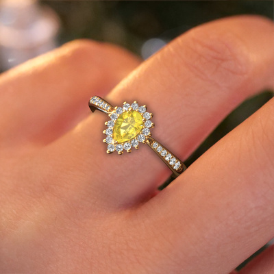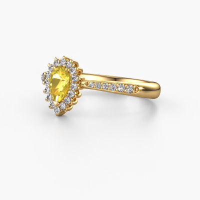 The ring shown above is called the Tilly per 2. We call this type of ring a cluster ring. The centre gemstone is surrounded by smaller sized stones. This 14 Carat gold version is set with a 6x4 mm pear yellow sapphire centre stone, embraced by smaller diamonds. What makes this exclusive gold cluster ring special is the setting of the smaller gems surrounding the centre yellow sapphire, which are shaped like a beautiful flower. The surrounding cluster of stones frame the middle centre stone in such a way to make it appear bigger. This type of engagement ring is also called a flower ring. It is very important that the smaller diamonds are positioned identically so there is no interference of light but perfect unity instead. Our skilled Goldsmiths get the job done. Each individual stone is carefully set by hand. During manufacturing, light fall is constantly monitored to make sure the special cluster effect is still visible. In the end you get the perfect engagement ring with a radiant yellow sapphire gemstone centrepiece. You can imagine the effect of a ring of such significance when you give tot the love of your life on her special day to shine. This jewel is made just for you, with attention to detail and design.After receiving your order, our goldsmiths will passionately start the creative process of making your engagement ring in our own studio. Because we don't have a big stockpile, these costs will not be passed on to you. Our pricing is proof of that! We offer top quality jewels at lowest price, guaranteed.Different styles of new rings are made daily by our team. Perhaps you have found a cluster engagement ring somewhere. One you would like to give to your loved one. Please feel free to share your thoughts and design with our jewel designers. We would love to turn your design into a exclusive engagement ring. You can follow the development of your ring design because we use very detailed 3D drawings. On top of that, you can order a dummy of the design. A dummy is a plastic ring, which can be shaped according your ring design. You can try it on and check if the engagement ring is up to standard. We will gladly send you a non-binding offer, based on a fair price/ quality ratio. The offer will baffle you, considering the quality of the ring and gemstones.To make it easier for you, we offer a 30 day return policy. Check our terms and conditions.