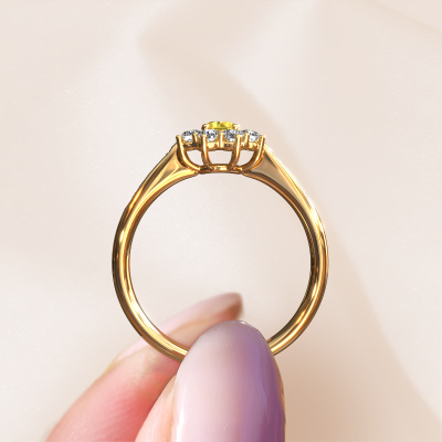 The ring shown above is called the Carolyn 2. We call this type of ring a cluster ring. The centre gemstone is surrounded by smaller sized stones. This 14 Carat gold version is set with a 3.4 mm round yellow sapphire centre stone, embraced by smaller diamonds. What makes this traditional gold cluster ring special is the setting of the smaller gems surrounding the centre yellow sapphire, which are shaped like a beautiful flower. The surrounding cluster of stones frame the middle centre stone in such a way to make it appear bigger. This type of engagement ring is also called a flower ring. It is very important that the smaller diamonds are positioned identically so there is no interference of light but perfect unity instead. Our skilled Goldsmiths get the job done. Each individual stone is carefully set by hand. During manufacturing, light fall is constantly monitored to make sure the special cluster effect is still visible. In the end you get the perfect engagement ring with a radiant yellow sapphire gemstone centrepiece. You can imagine the effect of a ring of such significance when you give tot the love of your life on her special day to shine. This jewel is unique in every way! Simply customize to your liking,Are you on a budget? Please feel free to contact us, so we can go discuss your options. We offer our engagement rings at guaranteed best price, because we make them to order. You won't find such a price anywhere else!Our team adds new designs to our online collection daily. Our designers and goldsmiths work together in creating the best design. We strive to offer a diverse collection of jewels. Perhaps you have a specific jewel design in mind. One you came across somewhere. Please contact us for a free consultation. We will make you an offer, based on a fair price/ quality ratio, that will baffle you.To make it easier for you, we offer a 30 day return policy. Check our terms and conditions.