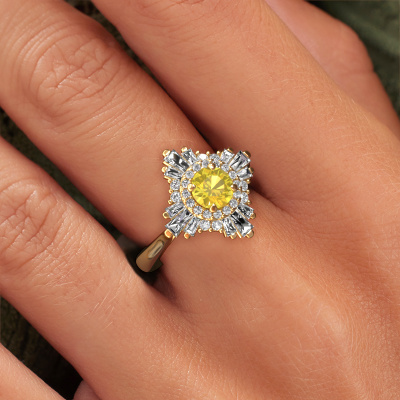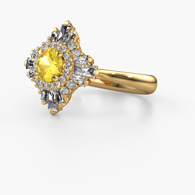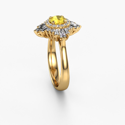 This 14 Carat gold ring is called Thalia and is set with 5.4 mm yellow sapphire. An extraordinary gold vintage ring. One that will surely make the love of your life shine like a diamond! That is what we hope to achieve. This vintage engagement ring is set with exquisite yellow sapphire. Whichever gemstone you choose from our selection, is up to you. The gemstone is selected with great care because we believe your special engagement ring must be adorned with nothing but the most beautiful gemstone. Wouldn't you agree? Our expert goldsmith will design your ring in our own crafting studio, where the yellow sapphire will be set with great precision. The ring will then be polished till it shines perfectly. Nothing but the best for the love of your life! This jewel is made with passion and love by one of our master goldsmiths.After receiving your order, our goldsmiths will passionately start the creative process of making your engagement ring in our own studio. Because we don't have a big stockpile, these costs will not be passed on to you. Our pricing is proof of that! We offer top quality jewels at lowest price, guaranteed.Have you found a specific engagement ring somewhere which you would like to give to your loved one? Please feel free to express your wishes to our jewel designers because we would be honoured to turn your design into a vintage engagement ring. You can follow the development of your ring design because we use 3D drawings. This gives you a realistic preview of how your design will look. You can also preorder a dummy. A dummy is a plastic ring, which can be shaped according your ring design. You can try it on and check if its width and size are suitable for you. We will gladly send you a non-binding offer, based on a fair price/ quality ratio. It will amaze you, considering the quality of the ring and gemstones.To make it easier for you, we offer a 30 day return policy. Check our terms and conditions.