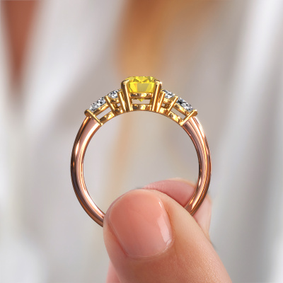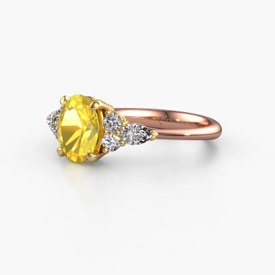 This 14 Carat rose gold ring is called Melani OVL and is set with 8x6 mm yellow sapphire. This exclusive rose gold cluster engagement ring is a true work of art! The ornaments are crafted with a lot of patience and great passion. In order to create this ring with great precision, this craft requires a keen eye and skilful hand. A challenge which ignites a fire in our expert goldsmith. The exquisite yellow sapphire are set in a special way so they stand out even more. This gives the ring an even more glamorous appearance. The stylish engagement ring is actually unique on its own because of the gemstones which we carefully select especially for this ring. On top of that you select the precious metals which will be used to create a unique ring for the most extraordinary woman in your life! This jewel is made by a team of passionate goldsmiths and jewel designers. This will make your crown jewel truly eye-catching.By using a combination of the latest modern techniques, combined with ancient crafting, we can make all our engagement rings in our own studio. Each jewel is made to order. This is advantageous because we can offer you a price you won't find anywhere else.Our designers and goldsmiths work together each day, creating new jewels. Perhaps you have found a nice fashionable engagement ring somewhere, which can be used to customize your unique ring. Please feel free to contact us. We will make you an offer, based on a fair price/ quality ratio, which will amaze you.To make it easier for you, we offer a 30 day return policy. Check our terms and conditions.