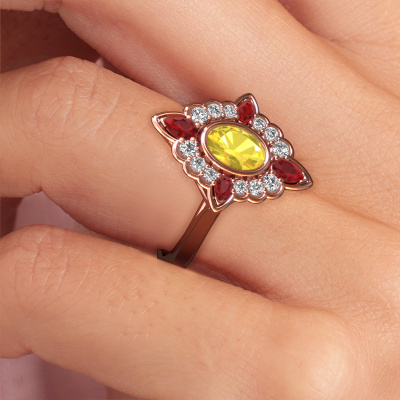 This 14 Carat rose gold ring is called Door and is set with 7x5 mm yellow sapphire. An extraordinary rose gold vintage ring. One that will surely make the love of your life shine like a diamond! That is what we hope to achieve. This vintage engagement ring is set with exquisite yellow sapphire. Whichever gemstone you choose from our selection, is up to you. The gemstone is selected with great care because we believe your daring engagement ring must be adorned with nothing but the most beautiful gemstone. Wouldn't you agree? Our expert goldsmith will design your ring in our own crafting studio, where the yellow sapphire will be set with great precision. The ring will then be polished till it shines perfectly. Nothing but the best for the love of your life! This jewel is made just for you by our master goldsmiths in our own studio.After receiving your order, our goldsmiths will passionately start the creative process of making your engagement ring in our own studio. Because we don't have a big stockpile, these costs will not be passed on to you. Our pricing is proof of that! We offer top quality jewels at lowest price, guaranteed.Our team adds new designs to our online collection daily. Our designers and goldsmiths work together in creating the best design. We strive to offer a diverse collection of jewels. Perhaps you have a specific jewel design in mind. One you came across somewhere. Please contact us for a free consultation. We will make you an offer, based on a fair price/ quality ratio, that will baffle you.To make it easier for you, we offer a 30 day return policy. Check our terms and conditions.