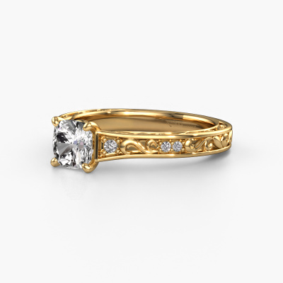 The ring shown above is called the Mallory cus. We call this type of ring a pavé solitaire ring because it has one centre gemstone and a band that is also pave set with gemstones. This engagement ring is made in 14 Carat gold set with a 5.5 mm cushion custom diamond, and pave set diamonds at the sides. Each piece of jewellery is made just for you by our master goldsmiths in our own studio.This Celtic gold pavé solitaire engagement ring has an exquisite cushion custom diamond centre stone. To further accentuate the centre stone, the band is set full with more diamonds. Its open prong setting allows light to strike the custom diamond from various angles and this adds sparkle to your custom diamond ring. The photo shown above depicts the goldsmith's carefully handcrafted details of the ring. The high positioning of the centre stone is truly eye-catching. The perfect engagement ring for the crown jewel of your life!By using our modern techniques, we can design and customize the finest quality jewels with the utmost care for you. Our engagement rings are always priced 30 percent lower than other jewellers. We make engagement rings to order so we don't have to maintain a large stock. If you have a certain budget, we are more than happy to advice you accordingly.Different styles of new rings are made daily by our team. Perhaps you have found a pavé solitaire engagement ring somewhere. One you would like to give to your loved one. Please feel free to share your thoughts and design with our jewel designers. We would love to turn your design into a Celtic engagement ring. You can follow the development of your ring design because we use very detailed 3D drawings. On top of that, you can order a dummy of the design. A dummy is a plastic ring, which can be shaped according your ring design. You can try it on and check if the engagement ring is up to standard. We will gladly send you a non-binding offer, based on a fair price/ quality ratio. The offer will baffle you, considering the quality of the ring and gemstones.To make it easier for you, we offer a 30 day return policy. Check our terms and conditions.