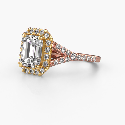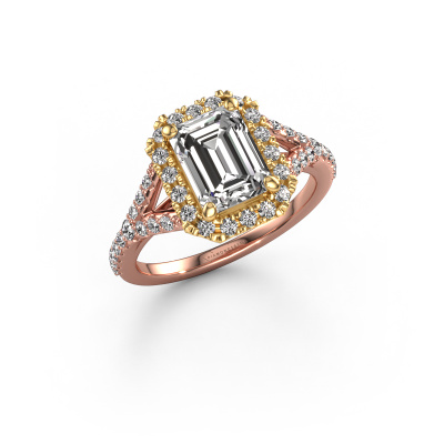 The ring shown above is called the Kimber EME. We call this type of ring a pavé solitaire ring because it has one centre gemstone and a band that is also pave set with gemstones. The 14 Carat rose gold engagement ring is set with a emerald cut 8x6 mm zirconia centre stone and the band is pave set with lab grown diamond gemstones. Each jewel is made by a team of passionate goldsmiths and jewel designers. This will make your crown jewel truly eye-catching.This exclusive rose gold pavé solitaire engagement ring has an exquisite emerald cut zirconia centre stone. To further accentuate the centre stone, the band is fully set with more lab-grown diamonds. Its open prong setting allows light to strike the zirconia from various angles and this adds sparkle to your zirconia ring. The photo shown above depicts the goldsmith's carefully handcrafted details of the ring. The high positioning of the centre stone is truly eye-catching. The perfect engagement ring for the crown jewel of your life! By using a combination of the latest modern techniques, combined with ancient crafting, we can make all our engagement rings in our own studio. Each jewel is made to order. This is advantageous because we can offer you a price you won't find anywhere else.Our team adds new designs to our online collection daily. Our designers and goldsmiths work together in creating the best design. We strive to offer a diverse collection of jewels. Perhaps you have a specific jewel design in mind. One you came across somewhere. Please contact us for a free consultation. We will make you an offer, based on a fair price/ quality ratio, that will baffle you.To make it easier for you, we offer a 30 day return policy. Check our terms and conditions.