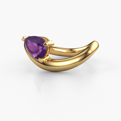 The ring shown above is called the Chloe PER. We call this a solitaire ring because it contains a single gemstone. The engagement ring is made in 14 Carat gold and has a pear amethyst of 8x6 mm. This extraordinary design gold solitaire engagement