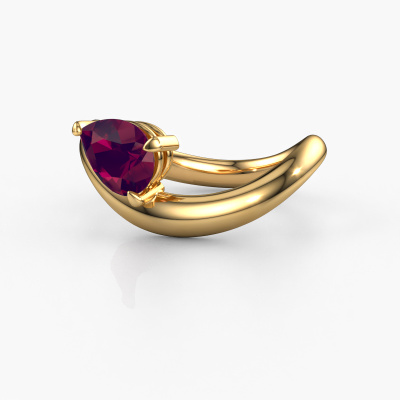 The ring shown above is called the Chloe PER. We call this a solitaire ring because it contains a single gemstone. The engagement ring is made in 14 Carat gold and has a pear rhodolite of 8x6 mm. This extraordinary design gold solitaire engagement