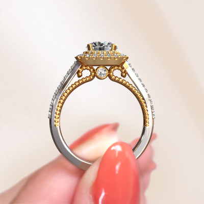 The ring shown above is called the Annette. We call this type of ring a halo ring because it has one centre gemstone and a band that is also pave set with gemstones. The 14 Carat white gold engagement ring is set with a round 1.00 crt diamond centre stone and the band is pave set with diamond gemstones. Each jewel is made just for you by our master goldsmiths in our own studio.This vintage white gold halo engagement ring has an exquisite round diamond centre stone. To further accentuate the centre stone, the band is fully set with more diamonds. Its open prong setting allows light to strike the diamond from various angles and this adds sparkle to your diamond ring. The photo shown above depicts the goldsmith's carefully handcrafted details of the ring. The high positioning of the centre stone is truly eye-catching. The perfect engagement ring for the crown jewel of your life! After receiving your order, our goldsmiths will passionately start the creative process of making your engagement ring in our own studio. Because we don't have a big stockpile, these costs will not be passed on to you. Our pricing is proof of that! We offer top quality jewels at lowest price, guaranteed.Have you found a specific engagement ring somewhere which you would like to give to your loved one? Please feel free to express your wishes to our jewel designers because we would be honoured to turn your design into a vintage engagement ring. You can follow the development of your ring design because we use 3D drawings. This gives you a realistic preview of how your design will look. You can also preorder a dummy. A dummy is a plastic ring, which can be shaped according your ring design. You can try it on and check if its width and size are suitable for you. We will gladly send you a non-binding offer, based on a fair price/ quality ratio. It will amaze you, considering the quality of the ring and gemstones.To make it easier for you, we offer a 30 day return policy. Check our terms and conditions.