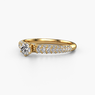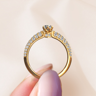 The ring shown above is called the Meryl. We call this type of ring a pavé solitaire ring because it has one centre gemstone and a band that is also pave set with gemstones. This engagement ring is made in 14 Carat gold set with a 0.30 crt round diamond, and pave set diamonds at the sides. Each piece of jewellery is made just for you, with attention to detail and design.This exclusive gold pavé solitaire engagement ring has an exquisite round diamond centre stone. To further accentuate the centre stone, the band is set full with more diamonds. Its open prong setting allows light to strike the diamond from various angles and this adds sparkle to your diamond ring. The photo shown above depicts the goldsmith's carefully handcrafted details of the ring. The high positioning of the centre stone is truly eye-catching. The perfect engagement ring for the crown jewel of your life!After receiving your order, our goldsmiths will passionately start the creative process of making your engagement ring in our own studio. Because we don't have a big stockpile, these costs will not be passed on to you. Our pricing is proof of that! We offer top quality jewels at lowest price, guaranteed.Have you found a specific engagement ring somewhere which you would like to give to your loved one? Please feel free to express your wishes to our jewel designers because we would be honoured to turn your design into a exclusive engagement ring. You can follow the development of your ring design because we use 3D drawings. This gives you a realistic preview of how your design will look. You can also preorder a dummy. A dummy is a plastic ring, which can be shaped according your ring design. You can try it on and check if its width and size are suitable for you. We will gladly send you a non-binding offer, based on a fair price/ quality ratio. It will amaze you, considering the quality of the ring and gemstones.To make it easier for you, we offer a 30 day return policy. Check our terms and conditions.