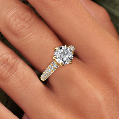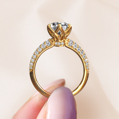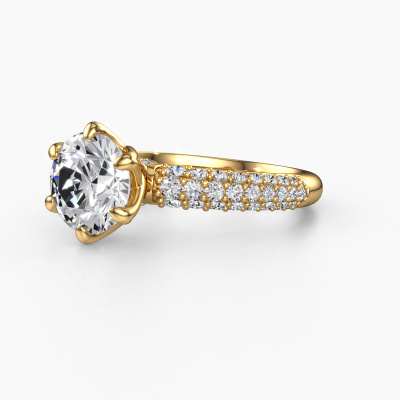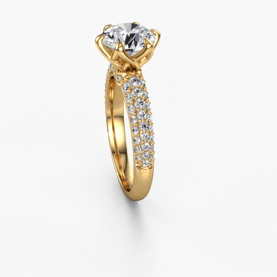 The ring shown above is called the Meryl. We call this type of ring a pavé solitaire ring because it has one centre gemstone and a band that is also pave set with gemstones. This engagement ring is made in 14 Carat gold set with a 2.00 crt round diamond, and pave set diamonds at the sides. Each piece of jewellery is made just for you, with attention to detail and design.This exclusive gold pavé solitaire engagement ring has an exquisite round diamond centre stone. To further accentuate the centre stone, the band is set full with more diamonds. Its open prong setting allows light to strike the diamond from various angles and this adds sparkle to your diamond ring. The photo shown above depicts the goldsmith's carefully handcrafted details of the ring. The high positioning of the centre stone is truly eye-catching. The perfect engagement ring for the crown jewel of your life!After receiving your order, our goldsmiths will passionately start the creative process of making your engagement ring in our own studio. Because we don't have a big stockpile, these costs will not be passed on to you. Our pricing is proof of that! We offer top quality jewels at lowest price, guaranteed.Have you found a specific engagement ring somewhere which you would like to give to your loved one? Please feel free to express your wishes to our jewel designers because we would be honoured to turn your design into a exclusive engagement ring. You can follow the development of your ring design because we use 3D drawings. This gives you a realistic preview of how your design will look. You can also preorder a dummy. A dummy is a plastic ring, which can be shaped according your ring design. You can try it on and check if its width and size are suitable for you. We will gladly send you a non-binding offer, based on a fair price/ quality ratio. It will amaze you, considering the quality of the ring and gemstones.To make it easier for you, we offer a 30 day return policy. Check our terms and conditions.