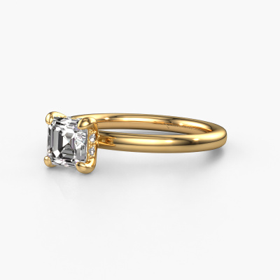 The ring shown above is called the Simone ASC 2. We call this type of ring a pavé solitaire ring because it has one centre gemstone and a band that is also pave set with gemstones. This engagement ring is made in 14 Carat gold set with a 1.00 crt asscher diamond, and pave set lab-grown diamonds at the sides. Each piece of jewellery is unique in every way! Simply customize to your liking,This exclusive gold pavé solitaire engagement ring has an exquisite asscher diamond centre stone. To further accentuate the centre stone, the band is set full with more lab-grown diamonds. Its open prong setting allows light to strike the diamond from various angles and this adds sparkle to your diamond ring. The photo shown above depicts the goldsmith's carefully handcrafted details of the ring. The high positioning of the centre stone is truly eye-catching. The perfect engagement ring for the crown jewel of your life!Because we design and deliver our own rings, we can offer you a engagement ring at a price you won't find anywhere else. A ring is made to order, which helps prevent excess supplies, so we can make you a great price offer. We understand it feels risky, buying your engagement ring online, but we will gladly assist in the designing process, taking your budget into consideration.Do you have a specific ring in mind? One you came across somewhere. Please feel free to tell us your wishes and we will turn your design into a unique engagement ring. You can follow the development of your ring design because we use 3D drawings. This gives you a realistic preview of your design. We will gladly send you a non-binding offer, based on a fair price/ quality ratio. It will amaze you.To make it easier for you, we offer a 30 day return policy. Check our terms and conditions.
