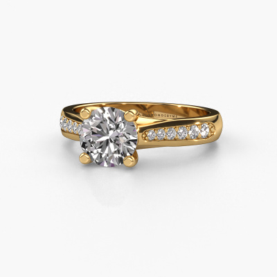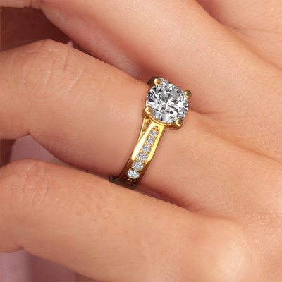 The ring shown above is called the Mia 2. We call this type of ring a pavé solitaire ring because it has one centre gemstone and a band that is also pave set with gemstones. This engagement ring is made in 14 Carat gold set with a 1.00 crt round diamond, and pave set lab-grown diamonds at the sides. Each piece of jewellery is made just for you, with attention to detail and design.This modern gold pavé solitaire engagement ring has an exquisite round diamond centre stone. To further accentuate the centre stone, the band is set full with more lab-grown diamonds. Its open prong setting allows light to strike the diamond from various angles and this adds sparkle to your diamond ring. The photo shown above depicts the goldsmith's carefully handcrafted details of the ring. The high positioning of the centre stone is truly eye-catching. The perfect engagement ring for the crown jewel of your life!By using our modern techniques, we can design and customize the finest quality jewels with the utmost care for you. Our engagement rings are always priced 30 percent lower than other jewellers. We make engagement rings to order so we don't have to maintain a large stock. If you have a certain budget, we are more than happy to advice you accordingly.Different styles of new rings are made daily by our team. Perhaps you have found a pavé solitaire engagement ring somewhere. One you would like to give to your loved one. Please feel free to share your thoughts and design with our jewel designers. We would love to turn your design into a modern engagement ring. You can follow the development of your ring design because we use very detailed 3D drawings. On top of that, you can order a dummy of the design. A dummy is a plastic ring, which can be shaped according your ring design. You can try it on and check if the engagement ring is up to standard. We will gladly send you a non-binding offer, based on a fair price/ quality ratio. The offer will baffle you, considering the quality of the ring and gemstones.To make it easier for you, we offer a 30 day return policy. Check our terms and conditions.