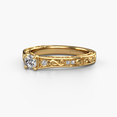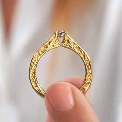 The ring shown above is called the Mallory rnd. We call this type of ring a pavé solitaire ring because it has one centre gemstone and a band that is also pave set with gemstones. This engagement ring is made in 14 Carat gold set with a 0.25 crt round diamond, and pave set lab-grown diamonds at the sides. Each piece of jewellery is made just for you by our master goldsmiths in our own studio.This vintage gold pavé solitaire engagement ring has an exquisite round diamond centre stone. To further accentuate the centre stone, the band is set full with more lab-grown diamonds. Its open prong setting allows light to strike the diamond from various angles and this adds sparkle to your diamond ring. The photo shown above depicts the goldsmith's carefully handcrafted details of the ring. The high positioning of the centre stone is truly eye-catching. The perfect engagement ring for the crown jewel of your life!Because we design and deliver our own rings, we can offer you a engagement ring at a price you won't find anywhere else. A ring is made to order, which helps prevent excess supplies, so we can make you a great price offer. We understand it feels risky, buying your engagement ring online, but we will gladly assist in the designing process, taking your budget into consideration.Different styles of new rings are made daily by our team. Perhaps you have found a pavé solitaire engagement ring somewhere. One you would like to give to your loved one. Please feel free to share your thoughts and design with our jewel designers. We would love to turn your design into a vintage engagement ring. You can follow the development of your ring design because we use very detailed 3D drawings. On top of that, you can order a dummy of the design. A dummy is a plastic ring, which can be shaped according your ring design. You can try it on and check if the engagement ring is up to standard. We will gladly send you a non-binding offer, based on a fair price/ quality ratio. The offer will baffle you, considering the quality of the ring and gemstones.To make it easier for you, we offer a 30 day return policy. Check our terms and conditions.