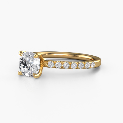 The ring shown above is called the Crystal CUS 2. We call this type of ring a pavé solitaire ring because it has one centre gemstone and a band that is also pave set with gemstones. The 14 Carat gold engagement ring is set with a cushion 1.50 crt diamond centre stone and the band is pave set with diamond gemstones. Each jewel is made just for you by our master goldsmiths in our own studio.This classic gold pavé solitaire engagement ring has an exquisite cushion diamond centre stone. To further accentuate the centre stone, the band is fully set with more diamonds. Its open prong setting allows light to strike the diamond from various angles and this adds sparkle to your diamond ring. The photo shown above depicts the goldsmith's carefully handcrafted details of the ring. The high positioning of the centre stone is truly eye-catching. The perfect engagement ring for the crown jewel of your life! After receiving your order, our goldsmiths will start the creative process of making your Crystal CUS 2 engagement ring. We don't keep stock. This is advantageous because these costs will not be passed on to you. Therefore, we can offer jewellery at exceptionally low prices.Different styles of new rings are made daily by our team. Perhaps you have found a pavé solitaire engagement ring somewhere. One you would like to give to your loved one. Please feel free to share your thoughts and design with our jewel designers. We would love to turn your design into a classic engagement ring. You can follow the development of your ring design because we use very detailed 3D drawings. On top of that, you can order a dummy of the design. A dummy is a plastic ring, which can be shaped according your ring design. You can try it on and check if the engagement ring is up to standard. We will gladly send you a non-binding offer, based on a fair price/ quality ratio. The offer will baffle you, considering the quality of the ring and gemstones.To make it easier for you, we offer a 30 day return policy. Check our terms and conditions.
