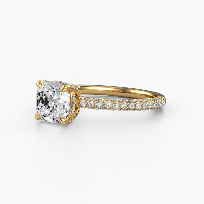 The ring shown above is called the Saskia 2 CUS. We call this type of ring a pavé solitaire ring because it has one centre gemstone and a band that is also pave set with gemstones. The 14 Carat gold engagement ring is set with a cushion 1.50 crt diamond centre stone and the band is pave set with lab grown diamond gemstones. Each jewel is made just for you, with attention to detail and design.This contemporary gold pavé solitaire engagement ring has an exquisite cushion diamond centre stone. To further accentuate the centre stone, the band is fully set with more lab-grown diamonds. Its open prong setting allows light to strike the diamond from various angles and this adds sparkle to your diamond ring. The photo shown above depicts the goldsmith's carefully handcrafted details of the ring. The high positioning of the centre stone is truly eye-catching. The perfect engagement ring for the crown jewel of your life! Are you on a budget? Please feel free to contact us, so we can go discuss your options. We offer our engagement rings at guaranteed best price, because we make them to order. You won't find such a price anywhere else!Our designers and goldsmiths work together each day, creating new jewels. Perhaps you have found a nice contemporary engagement ring somewhere, which can be used to customize your unique ring. Please feel free to contact us. We will make you an offer, based on a fair price/ quality ratio, which will amaze you.To make it easier for you, we offer a 30 day return policy. Check our terms and conditions.