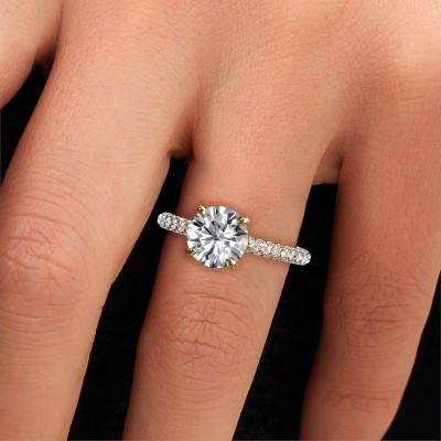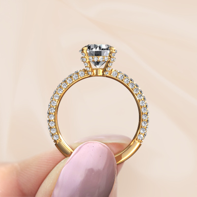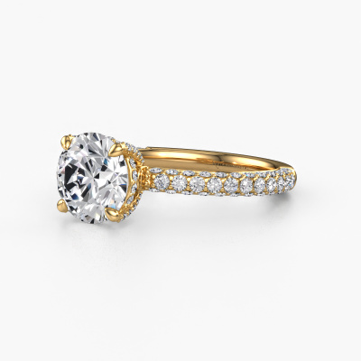 The ring shown above is called the Saskia RND 2. We call this type of ring a pavé solitaire ring because it has one centre gemstone and a band that is also pave set with gemstones. The 14 Carat gold engagement ring is set with a round 2.00 crt diamond centre stone and the band is pave set with lab grown diamond gemstones. Each jewel is made by a team of passionate goldsmiths and jewel designers. This will make your crown jewel truly eye-catching.This exclusive gold pavé solitaire engagement ring has an exquisite round diamond centre stone. To further accentuate the centre stone, the band is fully set with more lab-grown diamonds. Its open prong setting allows light to strike the diamond from various angles and this adds sparkle to your diamond ring. The photo shown above depicts the goldsmith's carefully handcrafted details of the ring. The high positioning of the centre stone is truly eye-catching. The perfect engagement ring for the crown jewel of your life! After receiving your order, our goldsmiths will passionately start the creative process of making your engagement ring in our own studio. Because we don't have a big stockpile, these costs will not be passed on to you. Our pricing is proof of that! We offer top quality jewels at lowest price, guaranteed.Our team adds new designs to our online collection daily. Our designers and goldsmiths work together in creating the best design. We strive to offer a diverse collection of jewels. Perhaps you have a specific jewel design in mind. One you came across somewhere. Please contact us for a free consultation. We will make you an offer, based on a fair price/ quality ratio, that will baffle you.To make it easier for you, we offer a 30 day return policy. Check our terms and conditions.