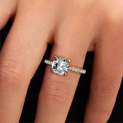 The ring shown above is called the Mignon RND 2. We call this type of ring a pavé solitaire ring because it has one centre gemstone and a band that is also pave set with gemstones. The 14 Carat gold engagement ring is set with a round 2.00 crt diamond centre stone and the band is pave set with lab grown diamond gemstones. Each jewel is made by a team of passionate goldsmiths and jewel designers. This will make your crown jewel truly eye-catching.This luxury gold pavé solitaire engagement ring has an exquisite round diamond centre stone. To further accentuate the centre stone, the band is fully set with more lab-grown diamonds. Its open prong setting allows light to strike the diamond from various angles and this adds sparkle to your diamond ring. The photo shown above depicts the goldsmith's carefully handcrafted details of the ring. The high positioning of the centre stone is truly eye-catching. The perfect engagement ring for the crown jewel of your life! By using our modern techniques, we can design and customize the finest quality jewels with the utmost care for you. Our engagement rings are always priced 30 percent lower than other jewellers. We make engagement rings to order so we don't have to maintain a large stock. If you have a certain budget, we are more than happy to advice you accordingly.Different styles of new rings are made daily by our team. Perhaps you have found a pavé solitaire engagement ring somewhere. One you would like to give to your loved one. Please feel free to share your thoughts and design with our jewel designers. We would love to turn your design into a luxury engagement ring. You can follow the development of your ring design because we use very detailed 3D drawings. On top of that, you can order a dummy of the design. A dummy is a plastic ring, which can be shaped according your ring design. You can try it on and check if the engagement ring is up to standard. We will gladly send you a non-binding offer, based on a fair price/ quality ratio. The offer will baffle you, considering the quality of the ring and gemstones.To make it easier for you, we offer a 30 day return policy. Check our terms and conditions.