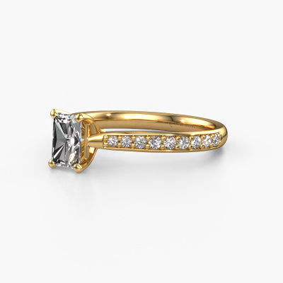 The ring shown above is called the Mignon rad 2. We call this type of ring a pavé solitaire ring because it has one centre gemstone and a band that is also pave set with gemstones. The 14 Carat gold engagement ring is set with a radiant 0.65 crt diamond centre stone and the band is pave set with diamond gemstones. Each jewel is unique in every way! Simply customize to your liking,This traditional gold pavé solitaire engagement ring has an exquisite radiant diamond centre stone. To further accentuate the centre stone, the band is fully set with more diamonds. Its open prong setting allows light to strike the diamond from various angles and this adds sparkle to your diamond ring. The photo shown above depicts the goldsmith's carefully handcrafted details of the ring. The high positioning of the centre stone is truly eye-catching. The perfect engagement ring for the crown jewel of your life! Are you on a budget? Please feel free to contact us, so we can go discuss your options. We offer our engagement rings at guaranteed best price, because we make them to order. You won't find such a price anywhere else!Have you found a specific engagement ring somewhere which you would like to give to your loved one? Please feel free to express your wishes to our jewel designers because we would be honoured to turn your design into a traditional engagement ring. You can follow the development of your ring design because we use 3D drawings. This gives you a realistic preview of how your design will look. You can also preorder a dummy. A dummy is a plastic ring, which can be shaped according your ring design. You can try it on and check if its width and size are suitable for you. We will gladly send you a non-binding offer, based on a fair price/ quality ratio. It will amaze you, considering the quality of the ring and gemstones.To make it easier for you, we offer a 30 day return policy. Check our terms and conditions.