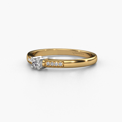 The ring shown above is called the Eline 2. We call this type of ring a pavé solitaire ring because it has one centre gemstone and a band that is also pave set with gemstones. The 14 Carat gold engagement ring is set with a round 0.055 crt diamond centre stone and the band is pave set with diamond gemstones. Each jewel is unique in every way! Simply customize to your liking,This modern gold pavé solitaire engagement ring has an exquisite round diamond centre stone. To further accentuate the centre stone, the band is fully set with more diamonds. Its open prong setting allows light to strike the diamond from various angles and this adds sparkle to your diamond ring. The photo shown above depicts the goldsmith's carefully handcrafted details of the ring. The high positioning of the centre stone is truly eye-catching. The perfect engagement ring for the crown jewel of your life! Because we design and deliver our own rings, we can offer you a engagement ring at a price you won't find anywhere else. A ring is made to order, which helps prevent excess supplies, so we can make you a great price offer. We understand it feels risky, buying your engagement ring online, but we will gladly assist in the designing process, taking your budget into consideration.Our team adds new designs to our online collection daily. Our designers and goldsmiths work together in creating the best design. We strive to offer a diverse collection of jewels. Perhaps you have a specific jewel design in mind. One you came across somewhere. Please contact us for a free consultation. We will make you an offer, based on a fair price/ quality ratio, that will baffle you.To make it easier for you, we offer a 30 day return policy. Check our terms and conditions.