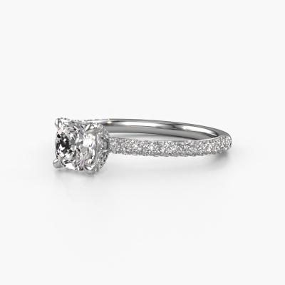 The ring shown above is called the Saskia 2 cus. We call this type of ring a pavé solitaire ring because it has one centre gemstone and a band that is also pave set with gemstones. The platinum engagement ring is set with a cushion 1.00 crt diamond centre stone and the band is pave set with lab grown diamond gemstones. Each jewel is made just for you, with attention to detail and design.This contemporary platinum pavé solitaire engagement ring has an exquisite cushion diamond centre stone. To further accentuate the centre stone, the band is fully set with more lab-grown diamonds. Its open prong setting allows light to strike the diamond from various angles and this adds sparkle to your diamond ring. The photo shown above depicts the goldsmith's carefully handcrafted details of the ring. The high positioning of the centre stone is truly eye-catching. The perfect engagement ring for the crown jewel of your life! Are you on a budget? Please feel free to contact us, so we can go discuss your options. We offer our engagement rings at guaranteed best price, because we make them to order. You won't find such a price anywhere else!Our designers and goldsmiths work together each day, creating new jewels. Perhaps you have found a nice contemporary engagement ring somewhere, which can be used to customize your unique ring. Please feel free to contact us. We will make you an offer, based on a fair price/ quality ratio, which will amaze you.To make it easier for you, we offer a 30 day return policy. Check our terms and conditions.