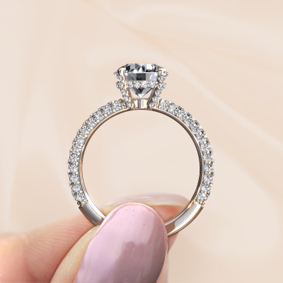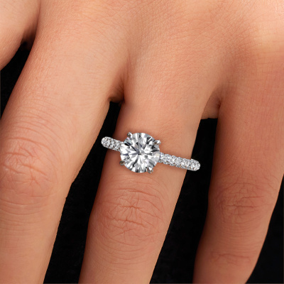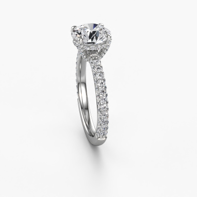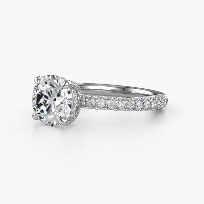 The ring shown above is called the Saskia RND 2. We call this type of ring a pavé solitaire ring because it has one centre gemstone and a band that is also pave set with gemstones. The platinum engagement ring is set with a round 2.00 crt diamond centre stone and the band is pave set with lab grown diamond gemstones. Each jewel is made by a team of passionate goldsmiths and jewel designers. This will make your crown jewel truly eye-catching.This exclusive platinum pavé solitaire engagement ring has an exquisite round diamond centre stone. To further accentuate the centre stone, the band is fully set with more lab-grown diamonds. Its open prong setting allows light to strike the diamond from various angles and this adds sparkle to your diamond ring. The photo shown above depicts the goldsmith's carefully handcrafted details of the ring. The high positioning of the centre stone is truly eye-catching. The perfect engagement ring for the crown jewel of your life! After receiving your order, our goldsmiths will passionately start the creative process of making your engagement ring in our own studio. Because we don't have a big stockpile, these costs will not be passed on to you. Our pricing is proof of that! We offer top quality jewels at lowest price, guaranteed.Our team adds new designs to our online collection daily. Our designers and goldsmiths work together in creating the best design. We strive to offer a diverse collection of jewels. Perhaps you have a specific jewel design in mind. One you came across somewhere. Please contact us for a free consultation. We will make you an offer, based on a fair price/ quality ratio, that will baffle you.To make it easier for you, we offer a 30 day return policy. Check our terms and conditions.