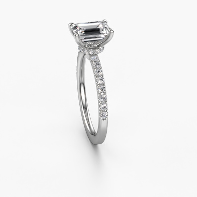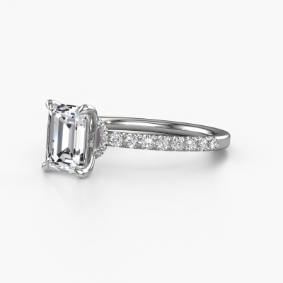 The ring shown above is called the Crystal EME 4. We call this type of ring a pavé solitaire ring because it has one centre gemstone and a band that is also pave set with gemstones. The platinum engagement ring is set with a emerald cut 1.50 crt diamond centre stone and the band is pave set with lab grown diamond gemstones. Each jewel is created to add sparkle to your finger, each jewel is lovingly made by hand by our goldsmiths.This fashionable platinum pavé solitaire engagement ring has an exquisite emerald cut diamond centre stone. To further accentuate the centre stone, the band is fully set with more lab-grown diamonds. Its open prong setting allows light to strike the diamond from various angles and this adds sparkle to your diamond ring. The photo shown above depicts the goldsmith's carefully handcrafted details of the ring. The high positioning of the centre stone is truly eye-catching. The perfect engagement ring for the crown jewel of your life! After receiving your order, our goldsmiths will passionately start the creative process of making your engagement ring in our own studio. Because we don't have a big stockpile, these costs will not be passed on to you. Our pricing is proof of that! We offer top quality jewels at lowest price, guaranteed.Our team adds new designs to our online collection daily. Our designers and goldsmiths work together in creating the best design. We strive to offer a diverse collection of jewels. Perhaps you have a specific jewel design in mind. One you came across somewhere. Please contact us for a free consultation. We will make you an offer, based on a fair price/ quality ratio, that will baffle you.To make it easier for you, we offer a 30 day return policy. Check our terms and conditions.