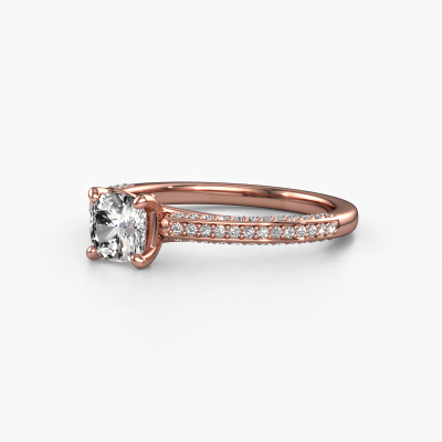 The ring shown above is called the Elenore cus. We call this type of ring a pavé solitaire ring because it has one centre gemstone and a band that is also pave set with gemstones. This engagement ring is made in 14 Carat rose gold set with a 0.70 crt cushion diamond, and pave set lab-grown diamonds at the sides. Each piece of jewellery is made by a team of passionate goldsmiths and jewel designers. This will make your crown jewel truly eye-catching.This contemporary rose gold pavé solitaire engagement ring has an exquisite cushion diamond centre stone. To further accentuate the centre stone, the band is set full with more lab-grown diamonds. Its open prong setting allows light to strike the diamond from various angles and this adds sparkle to your diamond ring. The photo shown above depicts the goldsmith's carefully handcrafted details of the ring. The high positioning of the centre stone is truly eye-catching. The perfect engagement ring for the crown jewel of your life!After receiving your order, our goldsmiths will start the creative process of making your Elenore cus engagement ring. We don't keep stock. This is advantageous because these costs will not be passed on to you. Therefore, we can offer jewellery at exceptionally low prices.Have you found a specific engagement ring somewhere which you would like to give to your loved one? Please feel free to express your wishes to our jewel designers because we would be honoured to turn your design into a contemporary engagement ring. You can follow the development of your ring design because we use 3D drawings. This gives you a realistic preview of how your design will look. You can also preorder a dummy. A dummy is a plastic ring, which can be shaped according your ring design. You can try it on and check if its width and size are suitable for you. We will gladly send you a non-binding offer, based on a fair price/ quality ratio. It will amaze you, considering the quality of the ring and gemstones.To make it easier for you, we offer a 30 day return policy. Check our terms and conditions.
