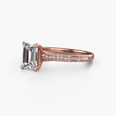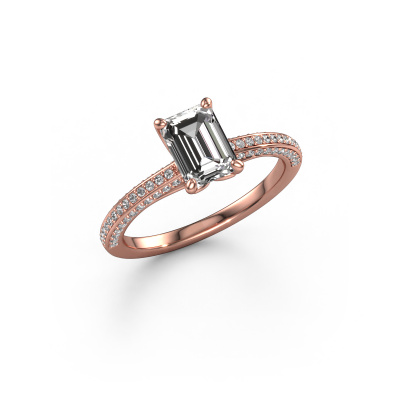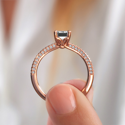 The ring shown above is called the Elenore eme. We call this type of ring a pavé solitaire ring because it has one centre gemstone and a band that is also pave set with gemstones. This engagement ring is made in 14 Carat rose gold set with a 1.15 crt emerald cut diamond, and pave set lab-grown diamonds at the sides. Each piece of jewellery is made just for you, with attention to detail and design.This exclusive rose gold pavé solitaire engagement ring has an exquisite emerald cut diamond centre stone. To further accentuate the centre stone, the band is set full with more lab-grown diamonds. Its open prong setting allows light to strike the diamond from various angles and this adds sparkle to your diamond ring. The photo shown above depicts the goldsmith's carefully handcrafted details of the ring. The high positioning of the centre stone is truly eye-catching. The perfect engagement ring for the crown jewel of your life!Are you on a budget? Please feel free to contact us, so we can go discuss your options. We offer our engagement rings at guaranteed best price, because we make them to order. You won't find such a price anywhere else!Have you found a specific engagement ring somewhere which you would like to give to your loved one? Please feel free to express your wishes to our jewel designers because we would be honoured to turn your design into a exclusive engagement ring. You can follow the development of your ring design because we use 3D drawings. This gives you a realistic preview of how your design will look. You can also preorder a dummy. A dummy is a plastic ring, which can be shaped according your ring design. You can try it on and check if its width and size are suitable for you. We will gladly send you a non-binding offer, based on a fair price/ quality ratio. It will amaze you, considering the quality of the ring and gemstones.To make it easier for you, we offer a 30 day return policy. Check our terms and conditions.