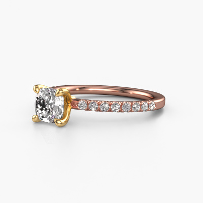 The ring shown above is called the Crystal CUS 2. We call this type of ring a pavé solitaire ring because it has one centre gemstone and a band that is also pave set with gemstones. The 14 Carat rose gold engagement ring is set with a cushion 1.00 crt diamond centre stone and the band is pave set with diamond gemstones. Each jewel is made just for you by our master goldsmiths in our own studio.This classic rose gold pavé solitaire engagement ring has an exquisite cushion diamond centre stone. To further accentuate the centre stone, the band is fully set with more diamonds. Its open prong setting allows light to strike the diamond from various angles and this adds sparkle to your diamond ring. The photo shown above depicts the goldsmith's carefully handcrafted details of the ring. The high positioning of the centre stone is truly eye-catching. The perfect engagement ring for the crown jewel of your life! After receiving your order, our goldsmiths will start the creative process of making your Crystal CUS 2 engagement ring. We don't keep stock. This is advantageous because these costs will not be passed on to you. Therefore, we can offer jewellery at exceptionally low prices.Different styles of new rings are made daily by our team. Perhaps you have found a pavé solitaire engagement ring somewhere. One you would like to give to your loved one. Please feel free to share your thoughts and design with our jewel designers. We would love to turn your design into a classic engagement ring. You can follow the development of your ring design because we use very detailed 3D drawings. On top of that, you can order a dummy of the design. A dummy is a plastic ring, which can be shaped according your ring design. You can try it on and check if the engagement ring is up to standard. We will gladly send you a non-binding offer, based on a fair price/ quality ratio. The offer will baffle you, considering the quality of the ring and gemstones.To make it easier for you, we offer a 30 day return policy. Check our terms and conditions.