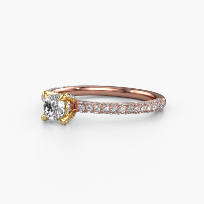 The ring shown above is called the Saskia 2 cus. We call this type of ring a pavé solitaire ring because it has one centre gemstone and a band that is also pave set with gemstones. The 14 Carat rose gold engagement ring is set with a cushion 0.33 crt diamond centre stone and the band is pave set with lab grown diamond gemstones. Each jewel is made just for you, with attention to detail and design.This contemporary rose gold pavé solitaire engagement ring has an exquisite cushion diamond centre stone. To further accentuate the centre stone, the band is fully set with more lab-grown diamonds. Its open prong setting allows light to strike the diamond from various angles and this adds sparkle to your diamond ring. The photo shown above depicts the goldsmith's carefully handcrafted details of the ring. The high positioning of the centre stone is truly eye-catching. The perfect engagement ring for the crown jewel of your life! Are you on a budget? Please feel free to contact us, so we can go discuss your options. We offer our engagement rings at guaranteed best price, because we make them to order. You won't find such a price anywhere else!Our designers and goldsmiths work together each day, creating new jewels. Perhaps you have found a nice contemporary engagement ring somewhere, which can be used to customize your unique ring. Please feel free to contact us. We will make you an offer, based on a fair price/ quality ratio, which will amaze you.To make it easier for you, we offer a 30 day return policy. Check our terms and conditions.