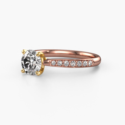 The ring shown above is called the Mignon rnd 2. We call this type of ring a pavé solitaire ring because it has one centre gemstone and a band that is also pave set with gemstones. The 14 Carat rose gold engagement ring is set with a round 1.00 crt diamond centre stone and the band is pave set with lab grown diamond gemstones. Each jewel is made by a team of passionate goldsmiths and jewel designers. This will make your crown jewel truly eye-catching.This luxury rose gold pavé solitaire engagement ring has an exquisite round diamond centre stone. To further accentuate the centre stone, the band is fully set with more lab-grown diamonds. Its open prong setting allows light to strike the diamond from various angles and this adds sparkle to your diamond ring. The photo shown above depicts the goldsmith's carefully handcrafted details of the ring. The high positioning of the centre stone is truly eye-catching. The perfect engagement ring for the crown jewel of your life! By using our modern techniques, we can design and customize the finest quality jewels with the utmost care for you. Our engagement rings are always priced 30 percent lower than other jewellers. We make engagement rings to order so we don't have to maintain a large stock. If you have a certain budget, we are more than happy to advice you accordingly.Different styles of new rings are made daily by our team. Perhaps you have found a pavé solitaire engagement ring somewhere. One you would like to give to your loved one. Please feel free to share your thoughts and design with our jewel designers. We would love to turn your design into a luxury engagement ring. You can follow the development of your ring design because we use very detailed 3D drawings. On top of that, you can order a dummy of the design. A dummy is a plastic ring, which can be shaped according your ring design. You can try it on and check if the engagement ring is up to standard. We will gladly send you a non-binding offer, based on a fair price/ quality ratio. The offer will baffle you, considering the quality of the ring and gemstones.To make it easier for you, we offer a 30 day return policy. Check our terms and conditions.