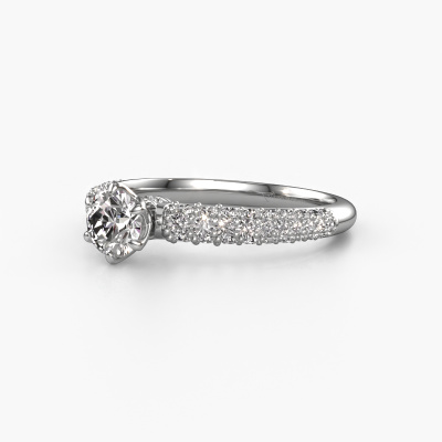 The ring shown above is called the Meryl. We call this type of ring a pavé solitaire ring because it has one centre gemstone and a band that is also pave set with gemstones. This engagement ring is made in 14 Carat white gold set with a 0.50 crt round diamond, and pave set diamonds at the sides. Each piece of jewellery is made just for you, with attention to detail and design.This exclusive white gold pavé solitaire engagement ring has an exquisite round diamond centre stone. To further accentuate the centre stone, the band is set full with more diamonds. Its open prong setting allows light to strike the diamond from various angles and this adds sparkle to your diamond ring. The photo shown above depicts the goldsmith's carefully handcrafted details of the ring. The high positioning of the centre stone is truly eye-catching. The perfect engagement ring for the crown jewel of your life!After receiving your order, our goldsmiths will passionately start the creative process of making your engagement ring in our own studio. Because we don't have a big stockpile, these costs will not be passed on to you. Our pricing is proof of that! We offer top quality jewels at lowest price, guaranteed.Have you found a specific engagement ring somewhere which you would like to give to your loved one? Please feel free to express your wishes to our jewel designers because we would be honoured to turn your design into a exclusive engagement ring. You can follow the development of your ring design because we use 3D drawings. This gives you a realistic preview of how your design will look. You can also preorder a dummy. A dummy is a plastic ring, which can be shaped according your ring design. You can try it on and check if its width and size are suitable for you. We will gladly send you a non-binding offer, based on a fair price/ quality ratio. It will amaze you, considering the quality of the ring and gemstones.To make it easier for you, we offer a 30 day return policy. Check our terms and conditions.