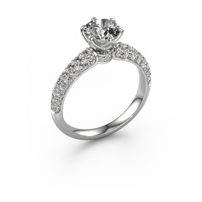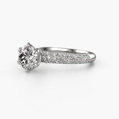 The ring shown above is called the Meryl. We call this type of ring a pavé solitaire ring because it has one centre gemstone and a band that is also pave set with gemstones. This engagement ring is made in 14 Carat white gold set with a 1.00 crt round diamond, and pave set diamonds at the sides. Each piece of jewellery is made just for you, with attention to detail and design.This exclusive white gold pavé solitaire engagement ring has an exquisite round diamond centre stone. To further accentuate the centre stone, the band is set full with more diamonds. Its open prong setting allows light to strike the diamond from various angles and this adds sparkle to your diamond ring. The photo shown above depicts the goldsmith's carefully handcrafted details of the ring. The high positioning of the centre stone is truly eye-catching. The perfect engagement ring for the crown jewel of your life!After receiving your order, our goldsmiths will passionately start the creative process of making your engagement ring in our own studio. Because we don't have a big stockpile, these costs will not be passed on to you. Our pricing is proof of that! We offer top quality jewels at lowest price, guaranteed.Have you found a specific engagement ring somewhere which you would like to give to your loved one? Please feel free to express your wishes to our jewel designers because we would be honoured to turn your design into a exclusive engagement ring. You can follow the development of your ring design because we use 3D drawings. This gives you a realistic preview of how your design will look. You can also preorder a dummy. A dummy is a plastic ring, which can be shaped according your ring design. You can try it on and check if its width and size are suitable for you. We will gladly send you a non-binding offer, based on a fair price/ quality ratio. It will amaze you, considering the quality of the ring and gemstones.To make it easier for you, we offer a 30 day return policy. Check our terms and conditions.