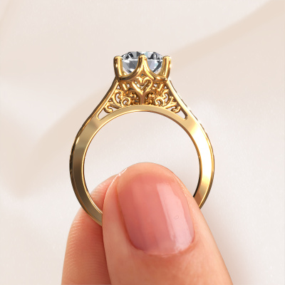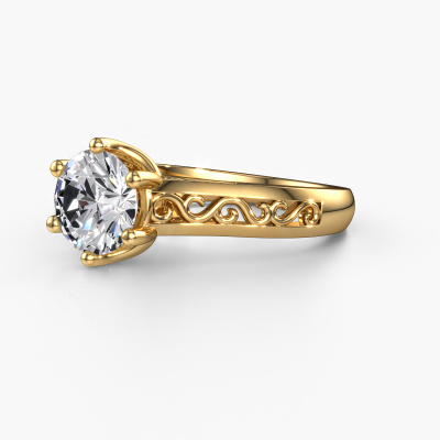 The ring shown above is called the Shan, we call this a solitaire ring because it contains a single gemstone. The engagement ring is made in 14 Carat gold and has a round diamond of 1.50 crt. The cool thing about our configurator is that you can compile your own piece of jewellery, into a completely personalized one. This solitaire ring is crafted in the precious metals gold with gold, but of course you are free to pick your own colours. Each piece of jewellery is made by a team of passionate goldsmiths and jewel designers. This will make your crown jewel truly eye-catching.The solitaire ring is a special type of engagement ring. Its open prong setting allows light to strike the gemstone from various angles. This Celtic engagement ring is a stunning eye-catcher because of the high positioning of the gemstone. In order for you to commemorate your proposal with a unique ring, we carefully adorn this solitaire ring by hand. The love of your life deserves nothing but the best. By using our modern techniques, we can design and customize the finest quality jewels with the utmost care for you. Our engagement rings are always priced 30 percent lower than other jewellers. We make engagement rings to order so we don't have to maintain a large stock. If you have a certain budget, we are more than happy to advice you accordingly.Have you found a specific engagement ring somewhere which you would like to give to your loved one? Please feel free to express your wishes to our jewel designers because we would be honoured to turn your design into a Celtic engagement ring. You can follow the development of your ring design because we use 3D drawings. This gives you a realistic preview of how your design will look. You can also preorder a dummy. A dummy is a plastic ring, which can be shaped according your ring design. You can try it on and check if its width and size are suitable for you. We will gladly send you a non-binding offer, based on a fair price/ quality ratio. It will amaze you, considering the quality of the ring and gemstones.To make it easier for you, we offer a 30 day return policy. Check our terms and conditions.