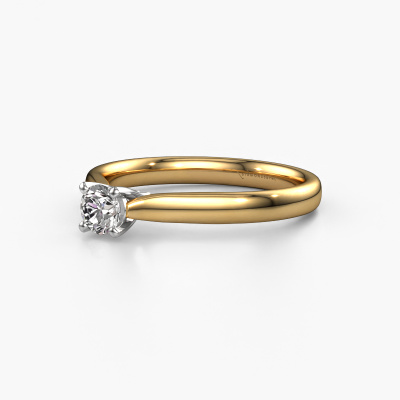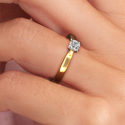 The ring shown above is called the Mignon rnd 1, we call this a solitaire ring because it contains a single gemstone. The engagement ring is made in 14 Carat gold and has a round diamond of 0.25 crt. The cool thing about our configurator is that you can compile your own piece of jewellery, into a completely personalized one. This solitaire ring is crafted in the precious metals gold with white gold, but of course you are free to pick your own colours. Each piece of jewellery is made with passion and love by one of our master goldsmiths.The solitaire ring is a special type of engagement ring. Its open prong setting allows light to strike the gemstone from various angles. This classic engagement ring is a stunning eye-catcher because of the high positioning of the gemstone. In order for you to commemorate your proposal with a unique ring, we carefully adorn this solitaire ring by hand. The love of your life deserves nothing but the best. After receiving your order, our goldsmiths will passionately start the creative process of making your engagement ring in our own studio. Because we don't have a big stockpile, these costs will not be passed on to you. Our pricing is proof of that! We offer top quality jewels at lowest price, guaranteed.Have you found a specific engagement ring somewhere which you would like to give to your loved one? Please feel free to express your wishes to our jewel designers because we would be honoured to turn your design into a classic engagement ring. You can follow the development of your ring design because we use 3D drawings. This gives you a realistic preview of how your design will look. You can also preorder a dummy. A dummy is a plastic ring, which can be shaped according your ring design. You can try it on and check if its width and size are suitable for you. We will gladly send you a non-binding offer, based on a fair price/ quality ratio. It will amaze you, considering the quality of the ring and gemstones.To make it easier for you, we offer a 30 day return policy. Check our terms and conditions.