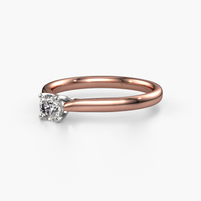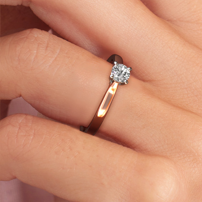 The ring shown above is called the Mignon rnd 1, we call this a solitaire ring because it contains a single gemstone. The engagement ring is made in 14 Carat rose gold and has a round diamond of 0.30 crt. The cool thing about our configurator is that you can compile your own piece of jewellery, into a completely personalized one. This solitaire ring is crafted in the precious metals rose gold with white gold, but of course you are free to pick your own colours. Each piece of jewellery is made with passion and love by one of our master goldsmiths.The solitaire ring is a special type of engagement ring. Its open prong setting allows light to strike the gemstone from various angles. This classic engagement ring is a stunning eye-catcher because of the high positioning of the gemstone. In order for you to commemorate your proposal with a unique ring, we carefully adorn this solitaire ring by hand. The love of your life deserves nothing but the best. After receiving your order, our goldsmiths will passionately start the creative process of making your engagement ring in our own studio. Because we don't have a big stockpile, these costs will not be passed on to you. Our pricing is proof of that! We offer top quality jewels at lowest price, guaranteed.Have you found a specific engagement ring somewhere which you would like to give to your loved one? Please feel free to express your wishes to our jewel designers because we would be honoured to turn your design into a classic engagement ring. You can follow the development of your ring design because we use 3D drawings. This gives you a realistic preview of how your design will look. You can also preorder a dummy. A dummy is a plastic ring, which can be shaped according your ring design. You can try it on and check if its width and size are suitable for you. We will gladly send you a non-binding offer, based on a fair price/ quality ratio. It will amaze you, considering the quality of the ring and gemstones.To make it easier for you, we offer a 30 day return policy. Check our terms and conditions.