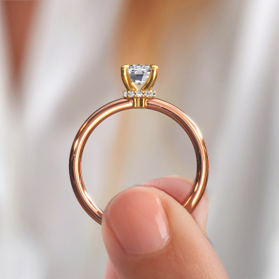 The ring shown above is called the Crystal CSH 3, we call this a solitaire ring because it contains a single gemstone. The engagement ring is made in 14 Carat rose gold and has a cushion rectangle diamond of 1.00 crt. The cool thing about our configurator is that you can compile your own piece of jewellery, into a completely personalized one. This solitaire ring is crafted in the precious metals rose gold with gold, but of course you are free to pick your own colours. Each piece of jewellery is created to add sparkle to your finger, each jewel is lovingly made by hand by our goldsmiths.The solitaire ring is a special type of engagement ring. Its open prong setting allows light to strike the gemstone from various angles. This exclusive engagement ring is a stunning eye-catcher because of the high positioning of the gemstone. In order for you to commemorate your proposal with a unique ring, we carefully adorn this solitaire ring by hand. The love of your life deserves nothing but the best. After receiving your order, our goldsmiths will start the creative process of making your Crystal CSH 3 engagement ring. We don't keep stock. This is advantageous because these costs will not be passed on to you. Therefore, we can offer jewellery at exceptionally low prices.Have you found a specific engagement ring somewhere which you would like to give to your loved one? Please feel free to express your wishes to our jewel designers because we would be honoured to turn your design into a exclusive engagement ring. You can follow the development of your ring design because we use 3D drawings. This gives you a realistic preview of how your design will look. You can also preorder a dummy. A dummy is a plastic ring, which can be shaped according your ring design. You can try it on and check if its width and size are suitable for you. We will gladly send you a non-binding offer, based on a fair price/ quality ratio. It will amaze you, considering the quality of the ring and gemstones.To make it easier for you, we offer a 30 day return policy. Check our terms and conditions.
