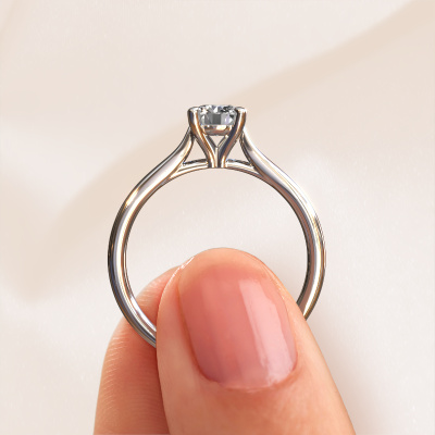 The ring shown above is called the Mignon rnd 1, we call this a solitaire ring because it contains a single gemstone. The engagement ring is made in 14 Carat white gold and has a round diamond of 0.60 crt. The cool thing about our configurator is that you can compile your own piece of jewellery, into a completely personalized one. This solitaire ring is crafted in the precious metals white gold with white gold, but of course you are free to pick your own colours. Each piece of jewellery is made with passion and love by one of our master goldsmiths.The solitaire ring is a special type of engagement ring. Its open prong setting allows light to strike the gemstone from various angles. This classic engagement ring is a stunning eye-catcher because of the high positioning of the gemstone. In order for you to commemorate your proposal with a unique ring, we carefully adorn this solitaire ring by hand. The love of your life deserves nothing but the best. After receiving your order, our goldsmiths will passionately start the creative process of making your engagement ring in our own studio. Because we don't have a big stockpile, these costs will not be passed on to you. Our pricing is proof of that! We offer top quality jewels at lowest price, guaranteed.Have you found a specific engagement ring somewhere which you would like to give to your loved one? Please feel free to express your wishes to our jewel designers because we would be honoured to turn your design into a classic engagement ring. You can follow the development of your ring design because we use 3D drawings. This gives you a realistic preview of how your design will look. You can also preorder a dummy. A dummy is a plastic ring, which can be shaped according your ring design. You can try it on and check if its width and size are suitable for you. We will gladly send you a non-binding offer, based on a fair price/ quality ratio. It will amaze you, considering the quality of the ring and gemstones.To make it easier for you, we offer a 30 day return policy. Check our terms and conditions.