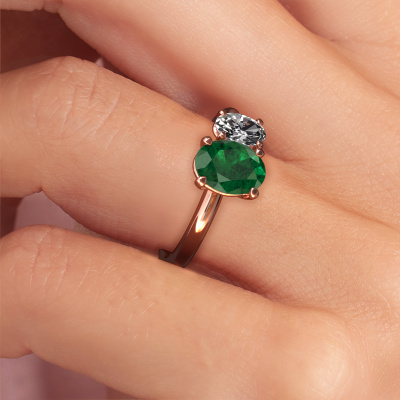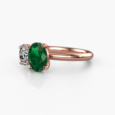 This 14 Carat rose gold ring is called Toi et Moi OVL-OVL and is set with emerald. How would you describe the style of the love of your life? Does she have a unique sense of style? This stunning sublime rose gold engagement ring can be custom-made to your own or her liking. Our emerald gemstones have been carefully selected because we believe your modern engagement ring must be adorned with nothing but the most beautiful gemstone. Don't you agree? This jewel is made by a team of passionate goldsmiths and jewel designers. This will make your crown jewel truly eye-catching.After receiving your order, our goldsmiths will start the creative process of making your Toi et Moi OVL-OVL engagement ring. We don't keep stock. This is advantageous because these costs will not be passed on to you. Therefore, we can offer jewellery at exceptionally low prices.Different styles of new rings are made daily by our team. Perhaps you have found a 2 stone engagement ring somewhere. One you would like to give to your loved one. Please feel free to share your thoughts and design with our jewel designers. We would love to turn your design into a modern engagement ring. You can follow the development of your ring design because we use very detailed 3D drawings. On top of that, you can order a dummy of the design. A dummy is a plastic ring, which can be shaped according your ring design. You can try it on and check if the engagement ring is up to standard. We will gladly send you a non-binding offer, based on a fair price/ quality ratio. The offer will baffle you, considering the quality of the ring and gemstones.To make it easier for you, we offer a 30 day return policy. Check our terms and conditions.