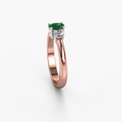 This 14 Carat rose gold ring is called Karie and is set with emerald. How would you describe the style of the love of your life? Does she have a unique sense of style? This stunning ajour rose gold engagement ring can be custom-made to your own or her liking. Our emerald gemstones have been carefully selected because we believe your traditional engagement ring must be adorned with nothing but the most beautiful gemstone. Don't you agree? This jewel is made just for you by our master goldsmiths in our own studio.After receiving your order, our goldsmiths will passionately start the creative process of making your engagement ring in our own studio. Because we don't have a big stockpile, these costs will not be passed on to you. Our pricing is proof of that! We offer top quality jewels at lowest price, guaranteed.Do you have a specific ring in mind? One you came across somewhere. Please feel free to tell us your wishes and we will turn your design into a unique engagement ring. You can follow the development of your ring design because we use 3D drawings. This gives you a realistic preview of your design. We will gladly send you a non-binding offer, based on a fair price/ quality ratio. It will amaze you.To make it easier for you, we offer a 30 day return policy. Check our terms and conditions.