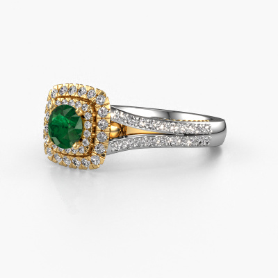 The ring shown above is called the Annette. We call this type of ring a halo ring because it has one centre gemstone and a band that is also pave set with gemstones. The 14 Carat white gold engagement ring is set with a round 5 mm emerald centre stone and the band is pave set with diamond gemstones. Each jewel is made just for you by our master goldsmiths in our own studio.This vintage white gold halo engagement ring has an exquisite round emerald centre stone. To further accentuate the centre stone, the band is fully set with more diamonds. Its open prong setting allows light to strike the emerald from various angles and this adds sparkle to your emerald ring. The photo shown above depicts the goldsmith's carefully handcrafted details of the ring. The high positioning of the centre stone is truly eye-catching. The perfect engagement ring for the crown jewel of your life! After receiving your order, our goldsmiths will passionately start the creative process of making your engagement ring in our own studio. Because we don't have a big stockpile, these costs will not be passed on to you. Our pricing is proof of that! We offer top quality jewels at lowest price, guaranteed.Have you found a specific engagement ring somewhere which you would like to give to your loved one? Please feel free to express your wishes to our jewel designers because we would be honoured to turn your design into a vintage engagement ring. You can follow the development of your ring design because we use 3D drawings. This gives you a realistic preview of how your design will look. You can also preorder a dummy. A dummy is a plastic ring, which can be shaped according your ring design. You can try it on and check if its width and size are suitable for you. We will gladly send you a non-binding offer, based on a fair price/ quality ratio. It will amaze you, considering the quality of the ring and gemstones.To make it easier for you, we offer a 30 day return policy. Check our terms and conditions.
