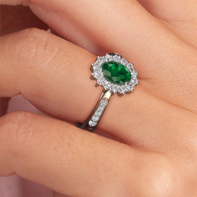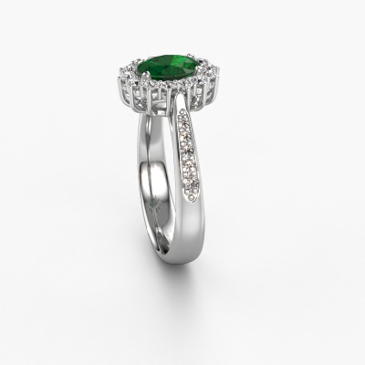 The ring shown above is called the Margien 2. We call this a Lady Diana ring. With an Lady Diana engagement ring, the larger centre gem is encircled by smaller side stones. This 14 Carat white gold ring is set with a 7x5 mm oval emerald gemstone, surrounded by smaller diamonds side stones. It's the most famous and celebrated engagement ring in the world; The Lady Diana ring. Exclusively meant for the most remarkable person in your life! A truly stunning aspect of this Lady Diana ring is its centre emerald. The smaller side stones embracing the emerald emphasize the sparkle of the centre gemstone, this makes it look as though they merge into one big gemstone. Due to its design, this is even more apparent in the Lady Di ring. Our expert Goldsmiths are keen to create a unique ring just for you. We can even customize the ring to your liking in our own crafting studio. This piece of jewellery is created to add sparkle to your finger, each jewel is lovingly made by hand by our goldsmiths.Are you on a budget? Please feel free to contact us, so we can go discuss your options. We offer our engagement rings at guaranteed best price, because we make them to order. You won't find such a price anywhere else!Our team adds new designs to our online collection daily. Our designers and goldsmiths work together in creating the best design. We strive to offer a diverse collection of jewels. Perhaps you have a specific jewel design in mind. One you came across somewhere. Please contact us for a free consultation. We will make you an offer, based on a fair price/ quality ratio, that will baffle you.To make it easier for you, we offer a 30 day return policy. Check our terms and conditions.