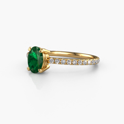 The ring shown above is called the Lynelle 2. We call this type of ring a pavé solitaire ring because it has one centre gemstone and a band that is also pave set with gemstones. This engagement ring is made in 14 Carat gold set with a 7x5 mm oval emerald, and pave set diamonds at the sides. Each piece of jewellery is created to add sparkle to your finger, each jewel is lovingly made by hand by our goldsmiths.This classic gold pavé solitaire engagement ring has an exquisite oval emerald centre stone. To further accentuate the centre stone, the band is set full with more diamonds. Its open prong setting allows light to strike the emerald from various angles and this adds sparkle to your emerald ring. The photo shown above depicts the goldsmith's carefully handcrafted details of the ring. The high positioning of the centre stone is truly eye-catching. The perfect engagement ring for the crown jewel of your life!After receiving your order, our goldsmiths will start the creative process of making your Lynelle 2 engagement ring. We don't keep stock. This is advantageous because these costs will not be passed on to you. Therefore, we can offer jewellery at exceptionally low prices.Do you have a specific ring in mind? One you came across somewhere. Please feel free to tell us your wishes and we will turn your design into a unique engagement ring. You can follow the development of your ring design because we use 3D drawings. This gives you a realistic preview of your design. We will gladly send you a non-binding offer, based on a fair price/ quality ratio. It will amaze you.To make it easier for you, we offer a 30 day return policy. Check our terms and conditions.
