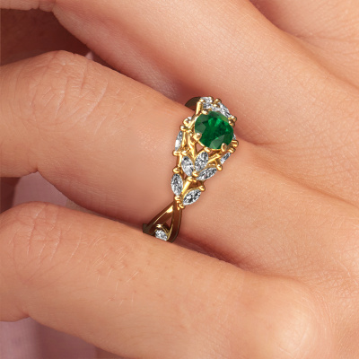 The ring shown above is called the Samantha RND. We call this type of ring a pavé solitaire ring because it has one centre gemstone and a band that is also pave set with gemstones. This engagement ring is made in 14 Carat gold set with a 5 mm round emerald, and pave set diamonds at the sides. Each piece of jewellery is made with passion and love by one of our master goldsmiths.This contemporary gold pavé solitaire engagement ring has an exquisite round emerald centre stone. To further accentuate the centre stone, the band is set full with more diamonds. Its open prong setting allows light to strike the emerald from various angles and this adds sparkle to your emerald ring. The photo shown above depicts the goldsmith's carefully handcrafted details of the ring. The high positioning of the centre stone is truly eye-catching. The perfect engagement ring for the crown jewel of your life!By using a combination of the latest modern techniques, combined with ancient crafting, we can make all our engagement rings in our own studio. Each jewel is made to order. This is advantageous because we can offer you a price you won't find anywhere else.Our designers and goldsmiths work together each day, creating new jewels. Perhaps you have found a nice contemporary engagement ring somewhere, which can be used to customize your unique ring. Please feel free to contact us. We will make you an offer, based on a fair price/ quality ratio, which will amaze you.To make it easier for you, we offer a 30 day return policy. Check our terms and conditions.